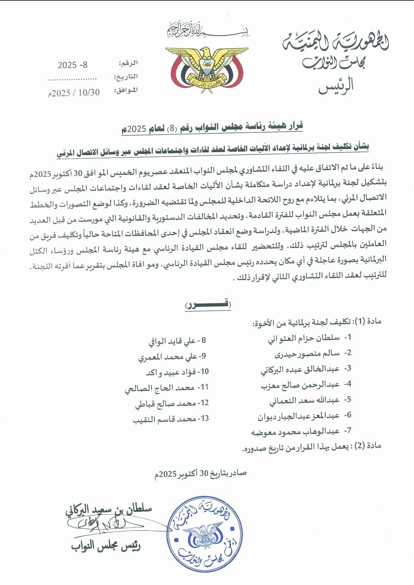 بتشكيل لجنة برلمانية لإعداد دراسة متكاملة بشأن الاًليات الخاصة لعقد لقاءات واجتماعات المجلس عبر وسائل الاتصال المرئي، بما يتلاءم مع روح اللائحة الداخلية للمجلس ولما تقتضيه الضرورة، وكذا لوضع التصورات والخطط المتعلقة بعمل مجلس النواب للفترة القادمة، وتحديد المخالفات الدستورية والقانونية التي مورست من قبل العديد من الجهات خلال الفترة الماضية، ولدراسة وضع انعقاد المجلس في إحدى المحافظات المتاحة حالياً وتكليف فريق من العاملين بالمجلس لترتيب ذلك، وللتحضير للقاء مجلس القيادة الرئاسي مع هيئة رئاسة المجلس ورؤساء الكتل البرلمانية بصورة عاجلة في أي مكان يحدده رئيس مجلس القيادة الرئاسي، وموافاة المجلس بتقرير عما أقرته اللجنة، للترتيب لعقد اللقاء التشاوري الثاني لإقرار ذلك.