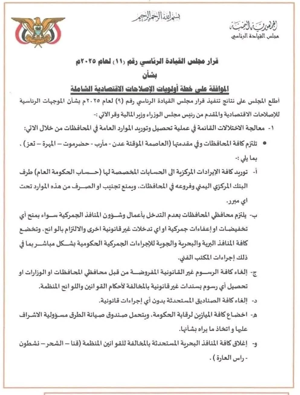 أقر مجلس القيادة الرئاسي خطة أولويات الإصلاحات الاقتصادية الشاملة، بموجب القرار رقم (11) لعام 2025م، وذلك في إطار معالجة الاختلالات المالية والإدارية وتعزيز الموارد العامة وضبط الإنفاق.