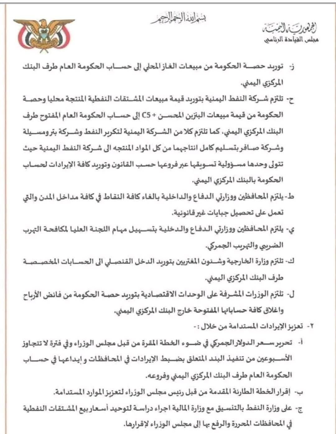 وتضمن كذلك إغلاق المنافذ البحرية غير القانونية مثل قنا والشحر ونشطون ورأس العارة، وتوريد حصة الحكومة من مبيعات الغاز والمشتقات النفطية إلى الحساب العام في البنك المركزي اليمني، إلى جانب إلغاء النقاط غير القانونية في مداخل المدن التي تفرض جبايات على المواطنين والتجار.
