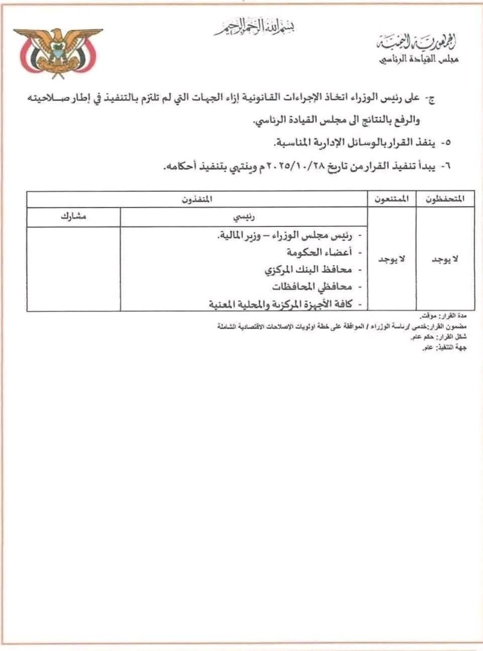وجاء القرار بعد استعراض المجلس نتائج تنفيذ قراره السابق رقم (9) لعام 2025م بشأن الموجهات الرئاسية للإصلاحات الاقتصادية، والمقدم من رئيس مجلس الوزراء وزير المالية الدكتور سالم صالح بن بريك.