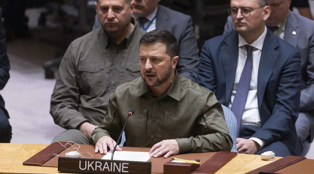 وقال زيلينسكي فيما كان سفير روسيا لدى الأمم المتحدة يجلس أمامه: «معظم العالم يعرف حقيقة هذه الحرب. إنها عدوان إجرامي وغير مبرر من جانب روسيا ضد بلدنا يهدف إلى السيطرة على أراضي أوكرانيا ومواردها».