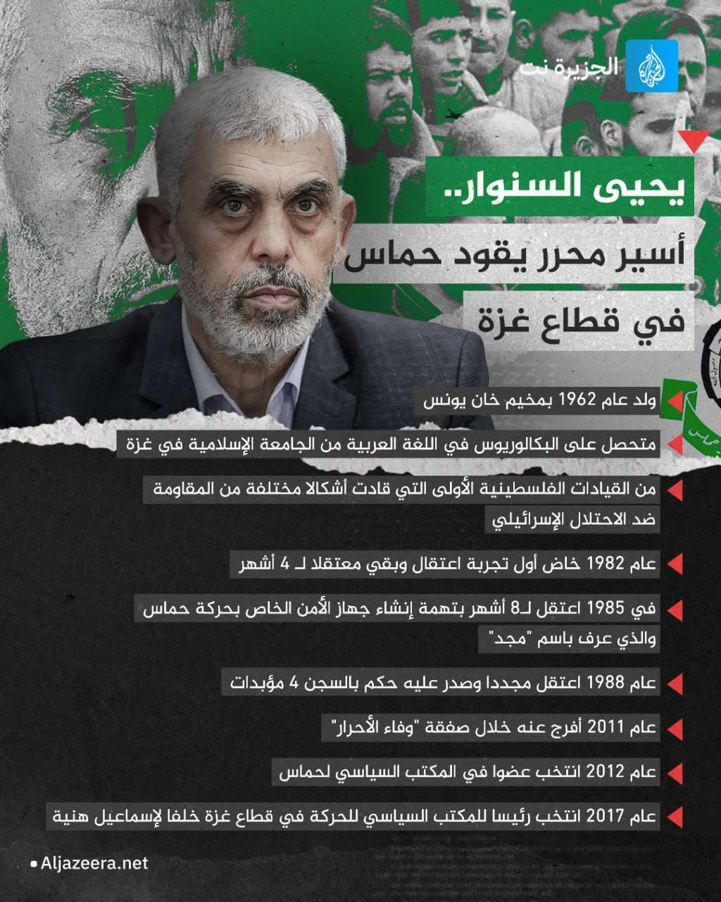 يحيى السنوار من أبرز عناصر المقاومة ضد الاحتلال الإسرائيلي، اعتقل مرات عدة وحكم عليه بأربعة مؤبدات. حرر في صفقة "وفاء الأحرار" عام 2011، وعاد ليشغل مراكز قيادية في حركة المقاومة الإسلامية (حماس) التي اختارته قائدا لها بغزة خلفا لإسماعيل هنية.