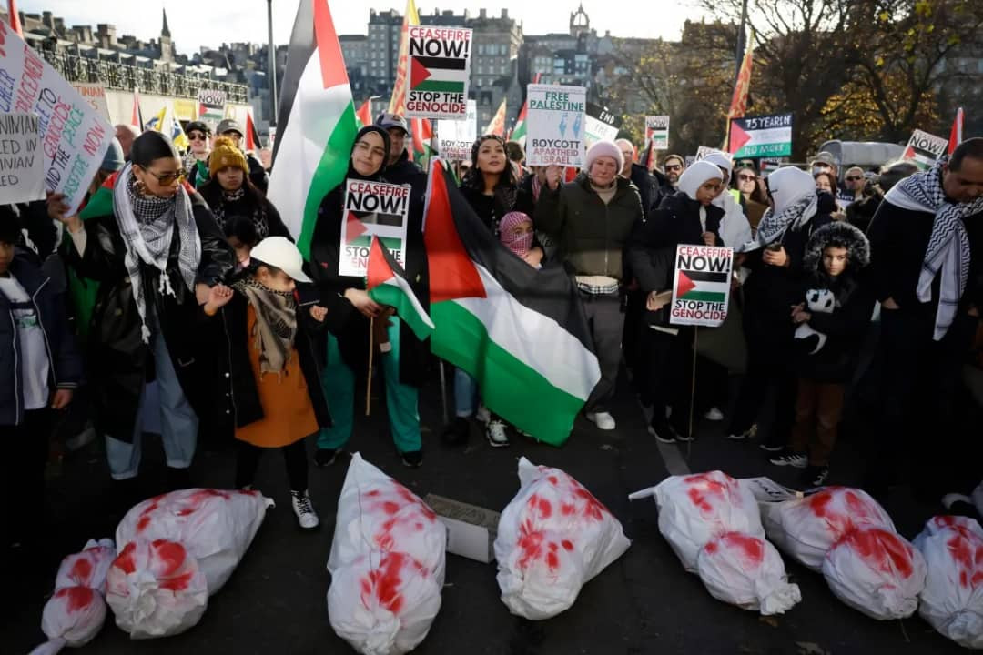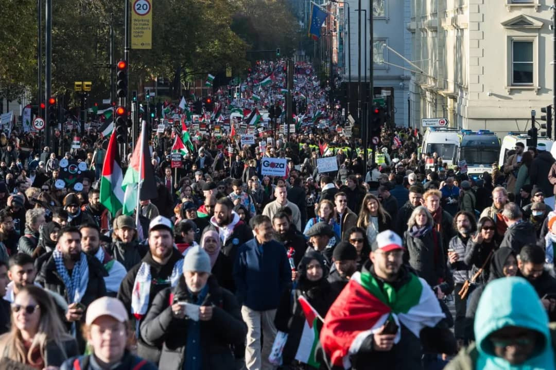 وقدّرت الشرطة البريطانية عدد المشاركين بالمسيرة -التي انطلقت تحت شعار "المسيرة الوطنية من أجل فلسطين"- بـ 300 ألف شخص، بينما توقعت جهات قريبة من المنظمين أن يكون العدد 750 ألفا.