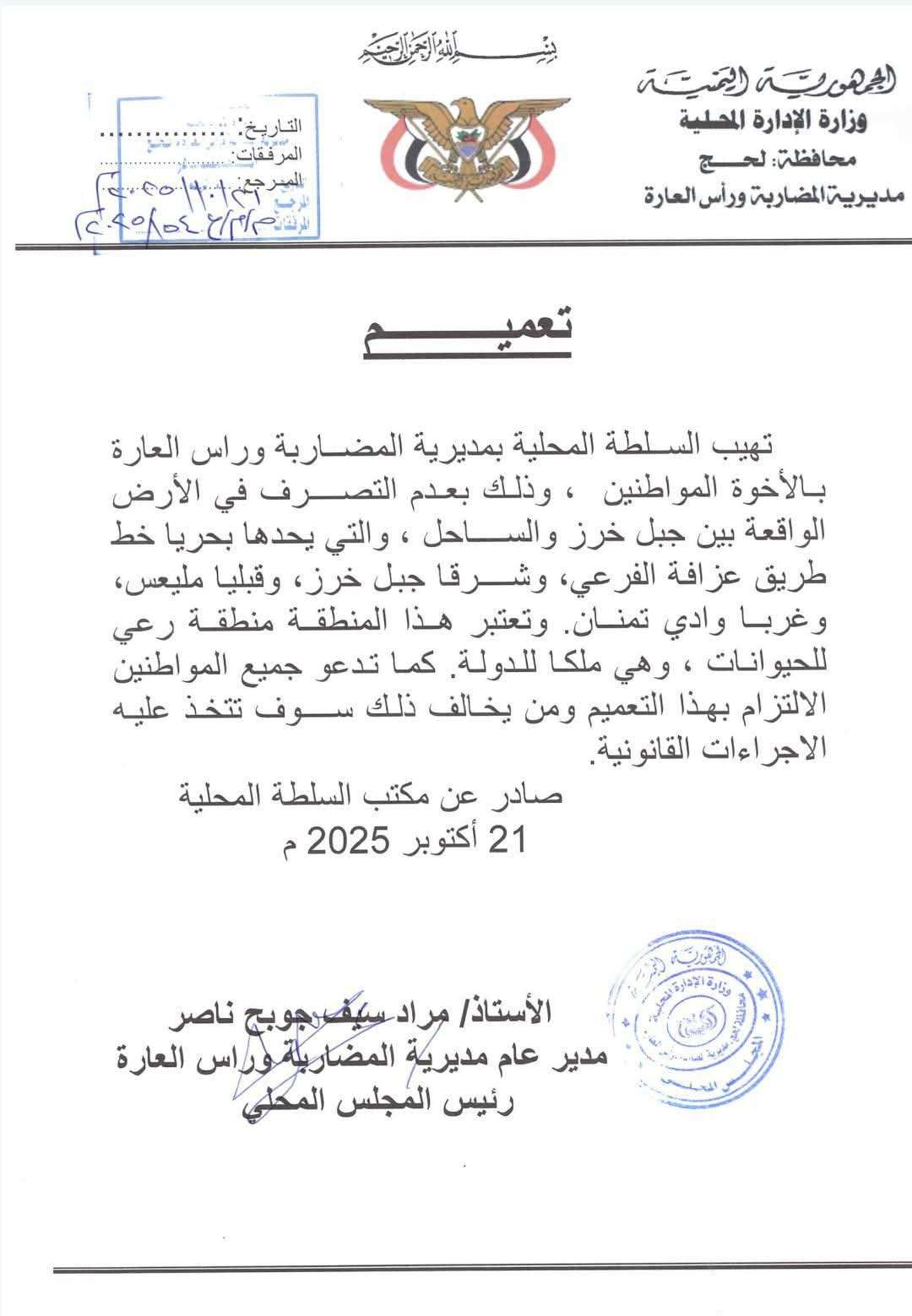 أصدرت السلطة المحلية بمديرية المضاربة ورأس العارة بمحافظة لحج تعميمًا إداريًا يقضي بوقف صرف الأراضي الواقعة بين جبل خرز والساحل، والمحددة ببحرًا خط طريق عزافة الفرعي وشرقًا جبل خرز وقبليًا مليعس وغربًا وادي تمنان.