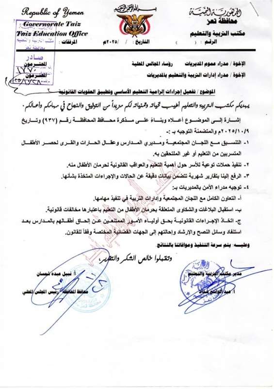 وبحسب وثيقة رسمية صادرة عن مكتب التربية والتعليم في تعز، وجّهت السلطات مديريات التربية والمجالس المحلية بتفعيل نظام "إلزامية التعليم الأساسي"، وتطبيق العقوبات القانونية بحق المتخلفين، إلى جانب التنسيق مع المدارس والسلطات المحلية لحصر الأطفال غير الملتحقين بالدراسة.